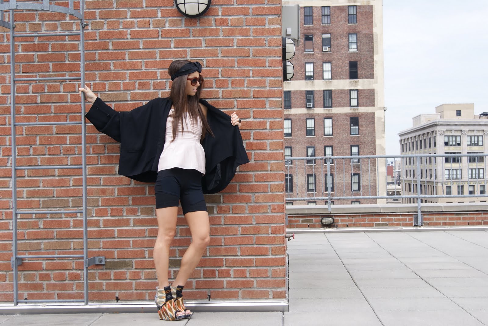 What I wore: Rose Fitted Corset Top c/o Kendall K., Mono Lake Scott Biker Shorts c/oFabricly, Vintage Dolan Sleeve Jacket by Dolce and Gabbana, Shoes by Julian Louie for Aldo, L. Erickson USA Knot Turban c/o France Luxe, Rings by Anuja Tolia and Vita Fede, Bracelet c/oMicky London, Sunglasses available for purchase LF Stores.
